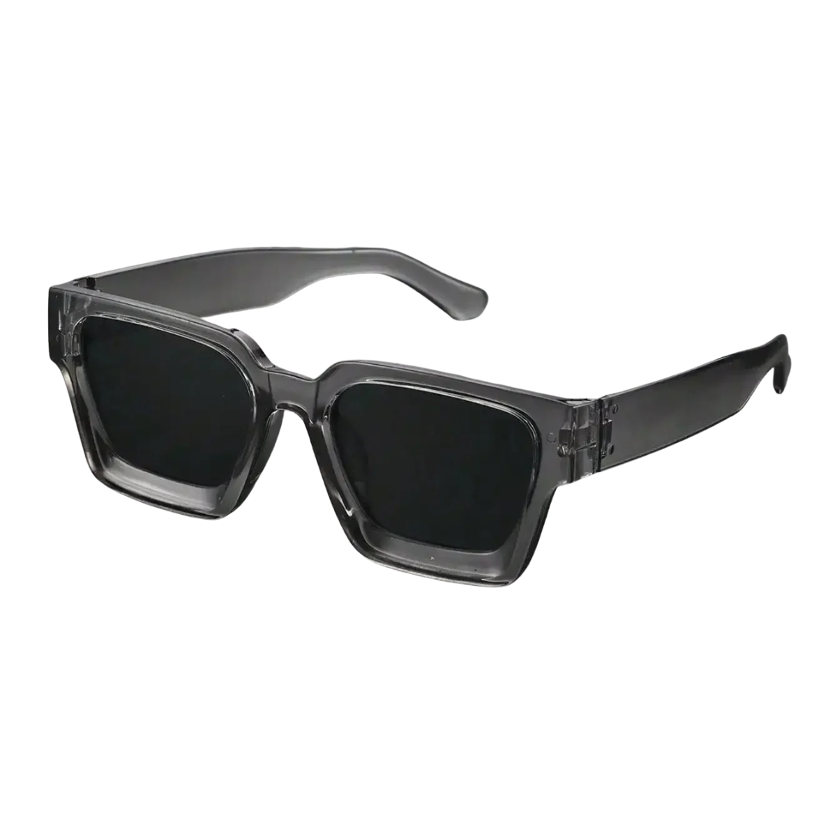 - Monture : Acétate transparent gris, lignes géométriques et angles nets pour un style résolument moderne.