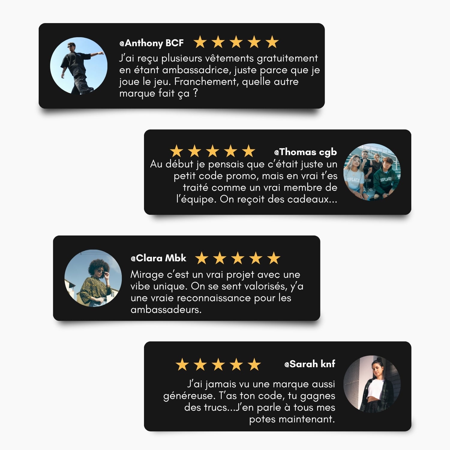 En tant qu’ambassadeur Mirage Paris, vous bénéficiez de -25 % sur votre première commande ainsi qu’un cadeau exclusif. Une fois votre commande validée, vous recevrez par e-mail toutes les instructions pour profiter de vos avantages. Vous pouvez postuler ici au statut d'ambassadeur.